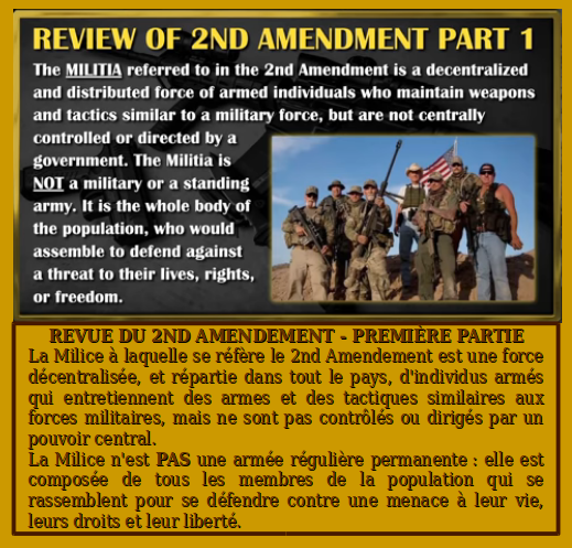 Selon le 2nd Amendement américain, la milice c’est le PEUPLE DANS SON ENTIÈRETÉ (hommes, femmes et enfants), et l’unique but de la milice américaine est de combattre toute velléité du gouvernement américain de lui ôter ses libertés, de l’asservir et de le voler. La milice américaine, de par la Constitution américaine, possède les mêmes armes que le gouvernement américain — sauf les chars et la bombe nucléaire qu’elle devrait pourtant logiquement posséder dans la mesure où le but est de lutter, le cas échéant, à armes égales. Cette milice n’est nullement destinée à être régulée par le gouvernement ni par aucune “autorité”, le peuple américain étant souverain sur son sol.