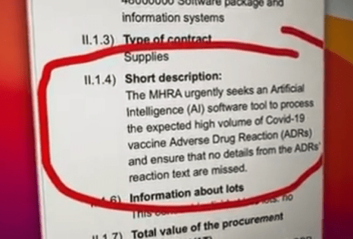 «II.1.4) Description succincte : la MHRA [l’agence de réglementation des médicaments et des produits de santé du Royaume-Uni] recherche de toute urgence un outil logiciel d’intelligence artificielle (IA) pour traiter le volume élevé d’effets indésirables attendus du vaccin Covid-19 et s’assurer qu’aucun détail du texte des réactions n’est omis.» (mon emphase)