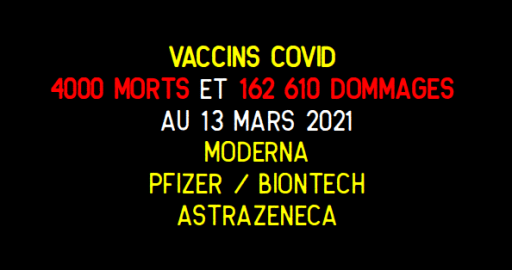 Leur rapport jusqu’au 13 mars 2021 répertorie 3 964 décès et 162 610 dommages suite aux injections de trois vaccins Covid-19 expérimentaux :