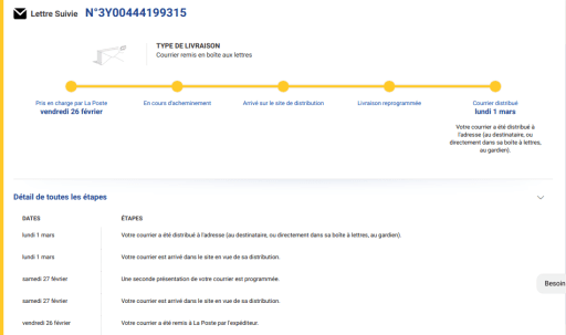 Petite mise à jour : je poste ici ce même courrier daté du 25 février 2021 (au lieu du 22 dont le numéro de suivi est 3Y00444199438) car j’avais oublié d’affranchir le pli et qu’il n’est pas arrivé à destination pour cette raison. Quand j’ai compris mon erreur, j’ai changé la date et réimprimé la lettre et l’ai postée, cette fois-ci, avec affranchissement, et elle est arrivée à bon port !