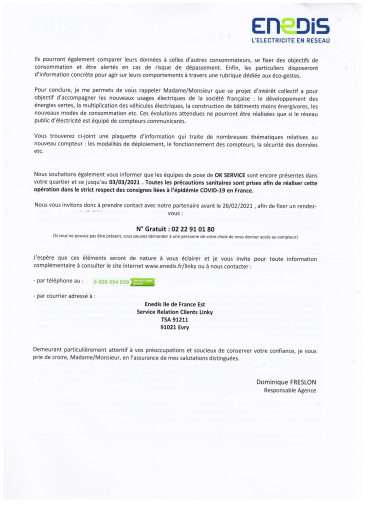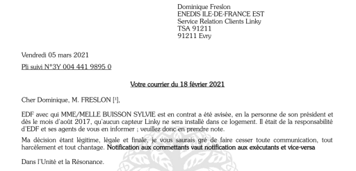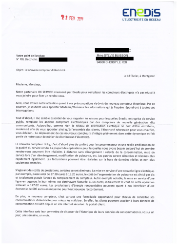 Voici un courrier que j’ai reçu d’ENEDIS le 22 février dernier — après un nombre incalculable de “rappels” (que je n’ai pas lus) depuis 2017 :