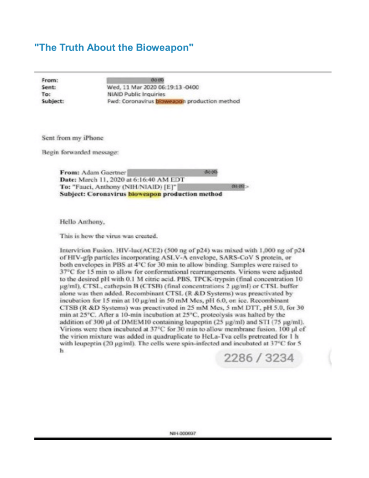 La deuxième chose à noter est que le courriel a été envoyé par une personne nommée Adam Gaertner. C’est un virologue qui communique avec Fauci assez régulièrement. Gaertner a authentifié le contenu de ce courriel sur Twitter et déplore que ses propres courriels sont désormais soumis à un examen à la demande de la FOIA. En parler ordinaire, ce courriels est réel. Ce n’est pas une désinformation russe, ni un mème, ni une farce Internet que quelqu’un a composée pour s’amuser.