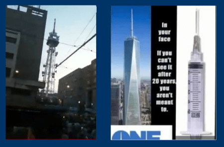 Mesdames et messieurs, de toute évidence, ils n’ont pas compris le 11 septembre ; nous ne pouvons donc pas vraiment compter sur eux pour comprendre ce qui se passe maintenant non plus. Mais voici un fait intéressant : le Bâtiment 1 du nouveau World Trade Center ressemble à une aiguille hypodermique géante. Tout comme ces tours de la mort [antennes 5G]. Il y a eu le déploiement de la 5G en même temps que cette plandémie. Il y a des aiguilles hypodermiques géantes partout ; c’est comme de la programmation prédictive. Et personne ne pose de questions. «Oh, c’est trop évident. C’est bien trop évident ; il ne pourrait y avoir de corrélation là… Il ne pourrait pas y avoir de corrélation entre la 5G et cette plandémie»…