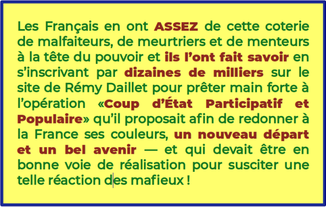 Les Français observent, médusés, qu’ils sont en train d’être MIS À MORT PAR INJECTION LÉTALE par les CRIMINELS AU POUVOIR qui ont décidé qu’ils étaient devenus INUTILES sur leurs propres terres ancestrales, sans pour autant qu’aucun d’entre ces criminels — de réels criminels, pour le coup, contrairement à Rémy Daillet Widedemann — dont l’étendue des CRIMES est visible où que se pose l’œil ne soit «mis en examen pour association de malfaiteurs terroriste criminelle»… Quelque chose me dit que le sketch ne s’arrêtera pas là… Il y aura forcément une chute !!