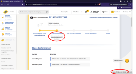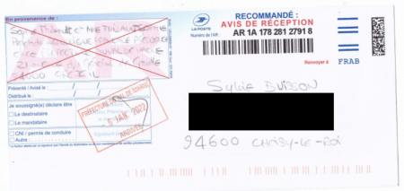 Toutefois, en sortant de chez moi plus tard, j’ai trouvé l’accusé de réception dans la boîte aux lettres ! Le courrier avait été livré le 06 janvier, soit le lendemain (daté du 03 et posté le 05) en total décalage avec le suivi postal internet… J’ouvre une parenthèse ici pour dire que les services postaux ne sont plus du tout fiables de nos jours ; ils sont devenus un véritable merdier et le cachet de La Poste ne fait plus foi [1]. Je ne prends même plus la peine de faire des réclamations : ça ne sert à rien… Fut un temps, les services postaux étaient une véritable fierté et un allié sans faille. Les époques changent…