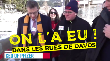CAUGHT HIM! Rebel News pummels Pfizer CEO with questions at World Economic Forum [On l’a eu !! « Rebel News » martèle Albert Bourla de questions à Davos !] [Traduction par Quantum Leap Traduction).