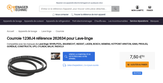 Après avoir raccroché, j’ai l’idée d’aller vérifier le prix des courroies de lave-linge sur internet et, surprise, ça ne dépasse pas 15 euros !!! Une courroie adaptée à mon lave-linge Whirpool coûte 5,80 euros chez Darty… Je lui envoie un texto [2] pour le lui dire et lui demande où il achète ses pièces. Il évite la question et répond qu’il y a aussi les paliers. Donc je vais vérifier le prix des paliers et note des prix très variés (selon le modèle de machine) jusqu’à 19 euros… Il me dit, pour sa défense, qu’il devra travaillé environ 1 heure à 1 heure et demie… Il ne lui avait fallu qu’une vingtaine de minutes pour remettre le tambour en place et noter ce qui n’allait pas… 1 heure et demie pour fixer deux paliers et une courroie ? Soit. Mais pourquoi mentir sur les prix ? Le prix des pièces est compris dans le forfait. Si elles ne coûtent pas ce prix, pourquoi devrais-je le payer ?