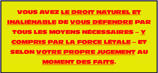 VOUS, ET NUL AUTRE, ÊTES RESPONSABLE DE VOTRE PROPRE SÉCURITÉ ET CELLE DE VOS PROCHES ! C’EST L’ORDRE NATUREL DES CHOSES. ET CE SERA DE PLUS EN PLUS NÉCESSAIRE DANS L’AVENIR…