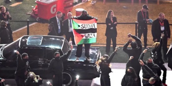 Drapeau de la Palestine levé par un homme lors du Superbowl en plein spectacle de K. Lamar