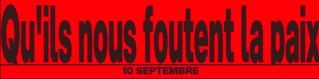 Pour ceux que cela pourrait intĂ©resser de le savoir, je ne participerai pas aux manifestations du 10 septembre prochain : je ne participe plus Ă aucune manifestation depuis 2007. Toute participation au «10 septembre» reviendrait Ă faire le jeu des mondialistes â dont nous sommes toujours les dindons de la farce â qui ont tout mis en place pour boucler leur agenda satanique.