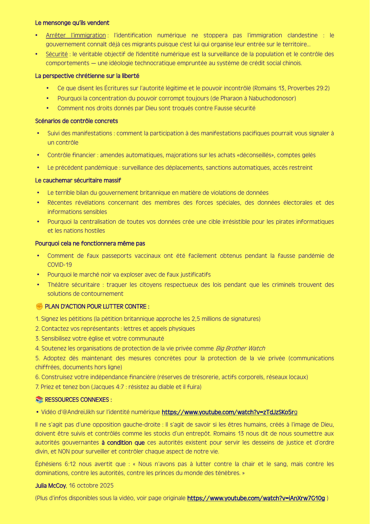 u BREAKING: UK SAYS NO TO DIGITAL ID! – Thousands Protest As UK Makes Digital ID Mandatory! [ SCOOP : LE PEUPLE BRITANNIQUE DIT NON À L’IDENTITÉ NUMÉRIQUE ! Des milliers de gens manifestent contre l’identité numérique rendue obligatoire ! ] [en anglais] : https://www.bitchute.com/video/643jb9gERcvS. Source : World Alternative Media https://www.bitchute.com/channel/gzFCj8AuSWgp , 19 octobre 2025.
