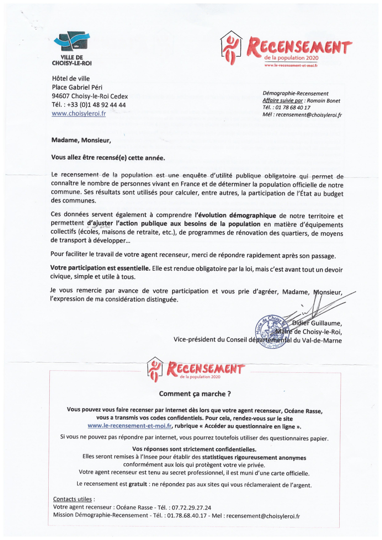 Je vous propose quelques courriers que j’ai envoyés à Commune de Choisy-le-Roi (raison sociale enregistrée), dite Mairie, pour lui signifier mon refus de lui transmettre la quantité astronomique de données personnelles qu’elle réclamait au moyen de ses formulaires de recensement et qui ne la concernent pas — voir les documents dans l’article intitulé «Sortez du milieu d’elle, mon peuple…» (Rév. 18:4).
